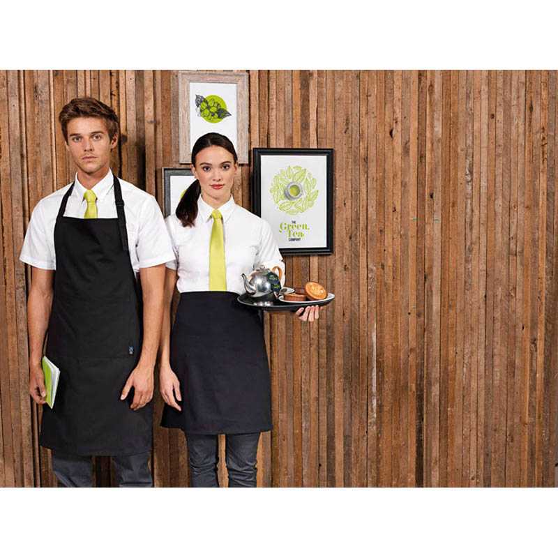 Popruh okolo krku s prackou na nastavenie výšky.Vrecko v strede s opačným kontrastným lemovaním s priehradkou na pero.Reverzné kontrastné džínsové vrecko v strede.Kovové okrúhle otvory upevnia 100 cm dlhé kontrastné textilné popruhy.Náprsné vrecko: šírka 13 cm, hĺbka 11,5 cm.Vrecko v páse: šírka 36 cm, hĺbka 17 cm .Strih sa zhoduje s PR128 ‘Domain’ Zástera do pása.