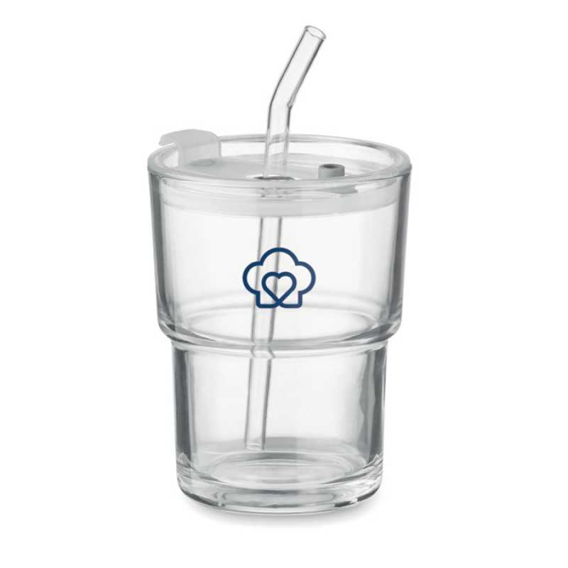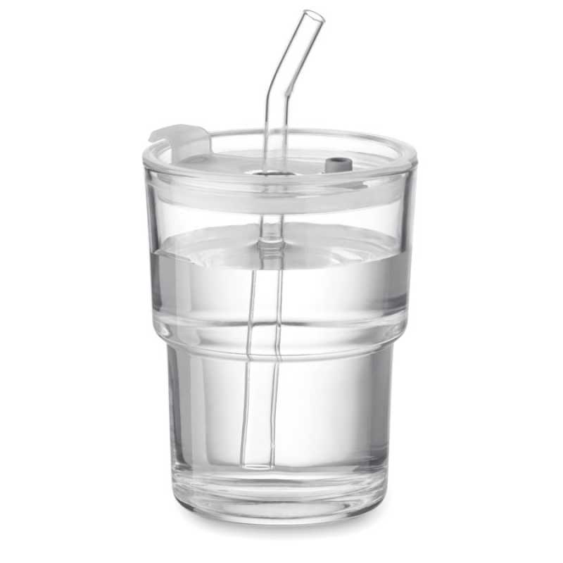NOVINKA 2025. Skleněný pohárek s víčkem a odnímatelným skleněným brčkem. Víčko umožňuje i přímé pití nápoje. Neteče. Objem 300 ml.