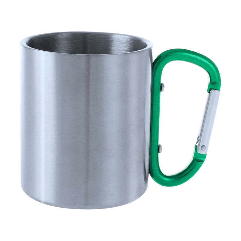 Dvouplášťový nerezový hrnek, rukojeť ve tvaru karabiny. 220 ml.
