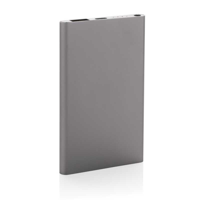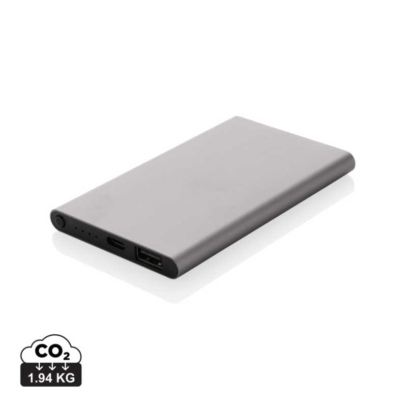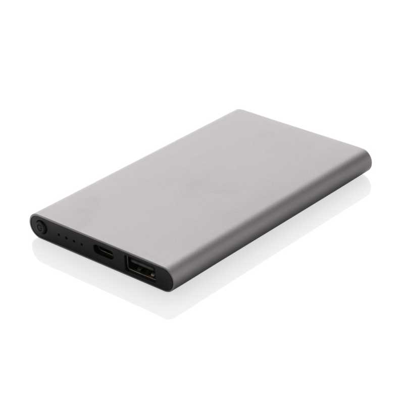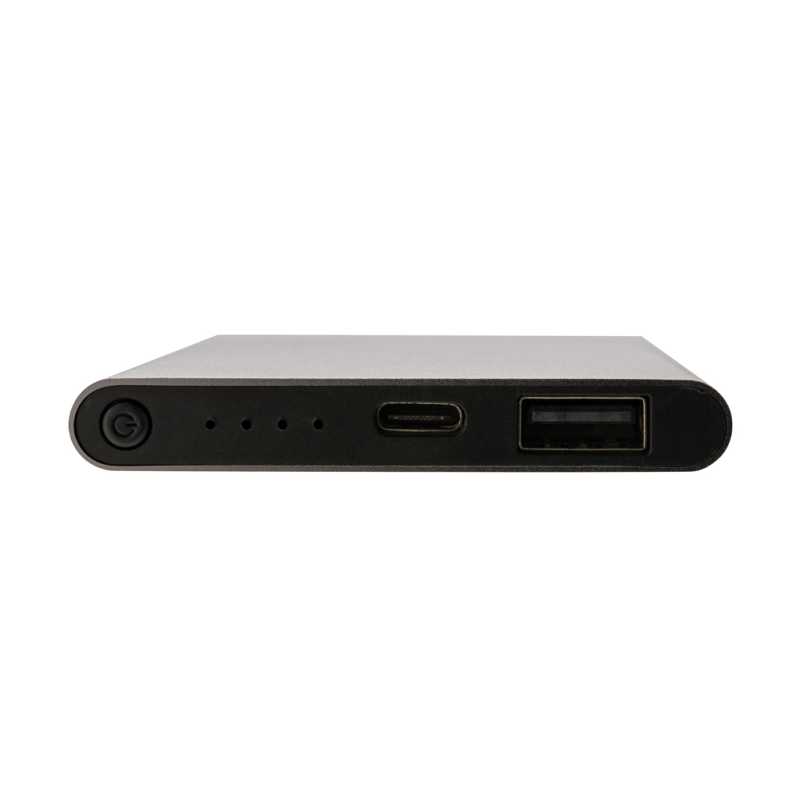 Plochá powerbanka 4 000 mAh vyrobená z recyklovaného hliníka a ABS plastu s RCS certifikáciou. RCS (Recycled Claim Standard) je globálny štandard, ktorý umožňuje overiť použitie recyklovaného materiálu v produkte naprieč celým dodávateľským reťazcom. Celkový podiel recyklátu podľa váhy produktu: 36%. Kvalitné lítium polymérová batéria radu A s kapacitou 4 000 mAh. Svetelné indikátory stupňa nabitia. USB vstup C: 5V/2A. USB C výstup: 5V/2A, USB A výstup: 5V/2A. Vrátane nabíjacieho kábla z recyklovaného TPE. Výrobok je kompletne bez PVC. Balené v FSC® kraftovej darčekovej krabičke.
