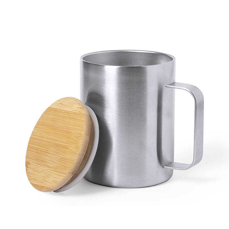 Stainless steel drinking mug (450 ml) with lid, double walled. Lid has a sliding opening for drinking. Anti-slip bottom. Individually packaged in a brown cardboard box.