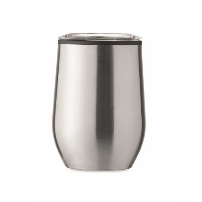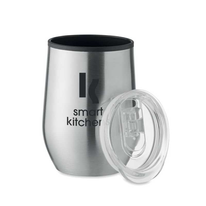 Dvoustěnný hrnek z nerezové oceli s vnitřkem z PP a průhledným PS víčkem. Objem: 350 ml.