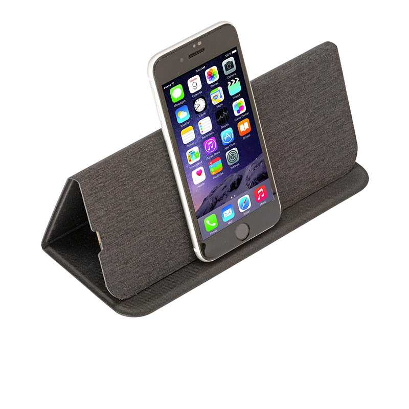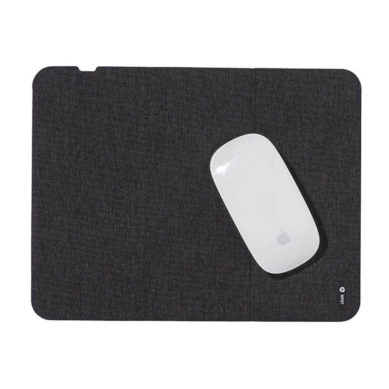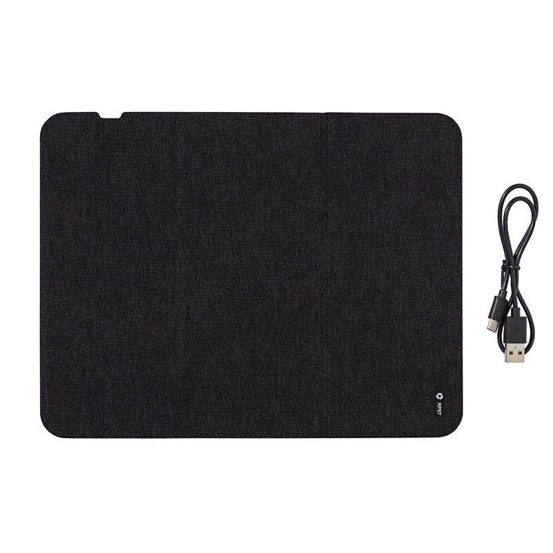 Mousepad and mobile phone holder in R-pet, with integrated wireless charger. USB charging cable included. Input: 9V / 2A . Wireless output: 9V / 1.1A 10w