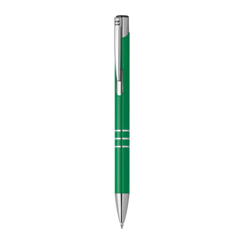 NOVINKA 2025. Eco-friendly ball pen made of recycled aluminium. Push-button mechanism, with barrel available in a wide range of metallic colours and chrome plated fittings. With metal clip and recycled aluminium logo on the top of the pen. Jumbo cartridge and blue ink.Recycled aluminum has its origin in the almost infinite reuse of one of the materials with the greatest recyclability potential, keeping the quality of the resulting product. This feature turns it into an eco-friendly material of recycled origin, easily recyclable. Besides, new material and resources can be obtained from treatment and waste processes, consuming less energy among others sustainable factors.GRS Certification (Global Recycled Standard), which guarantees the recycled origin of the material used to manufacture the product.