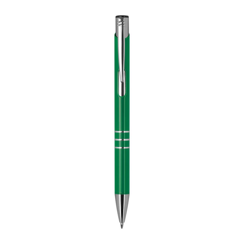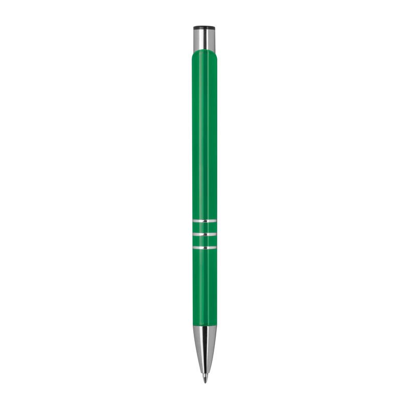 Plne lakované kovové guľôčkové pero s 3 ozdobnými prúžkami. Pero má veľkú modrú náplň.