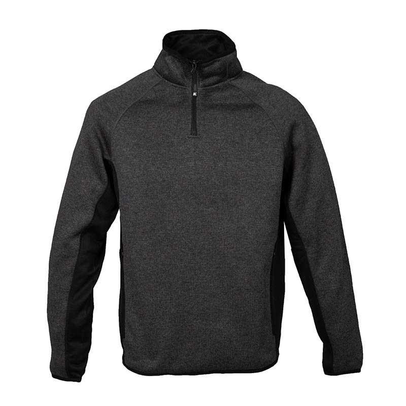 80 % bavlna/20 % polyester (popolová prskaná: 79 % bavlna/20 % polyester/1 % viskóza).Úprava LSF (Low Shrinkage Fleece).3-vláknový kartáčovaný flís z česanej bavlny.Vsadené rukávy.Zips pri krku s plastovým zipsom v rovnakej farbe.Kontrastné podlepený výstrih (kontrastná oxfordská sivá pre všetky farby, okrem tela v oxfordskej sivej a popolovej prskanej, kde je páska pri krku v námorníckej).Rebrované manžety a lem.Certifikát STANDARD 100 podľa OEKO-TEX®N° CQ1007/7, IFTH.