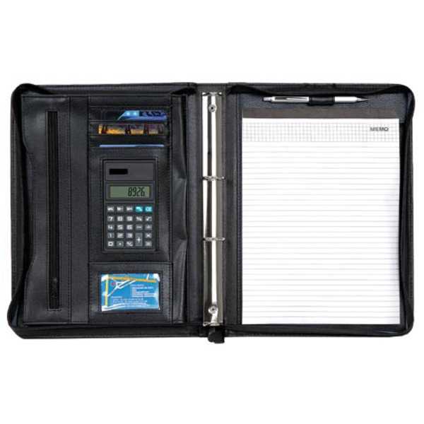 Konferenčná zložka z PU s kalkulačkou so zapínaním na zips a úchytom v štýle aktovky. Obsahuje krúžkovú väzbu na dosky s dokumentmi, priehradky na dokumenty, držiak na pero, vrecká na vizitky, vrecko so zapínaním na zips a poznámkový blok A4 linajkový. Ba