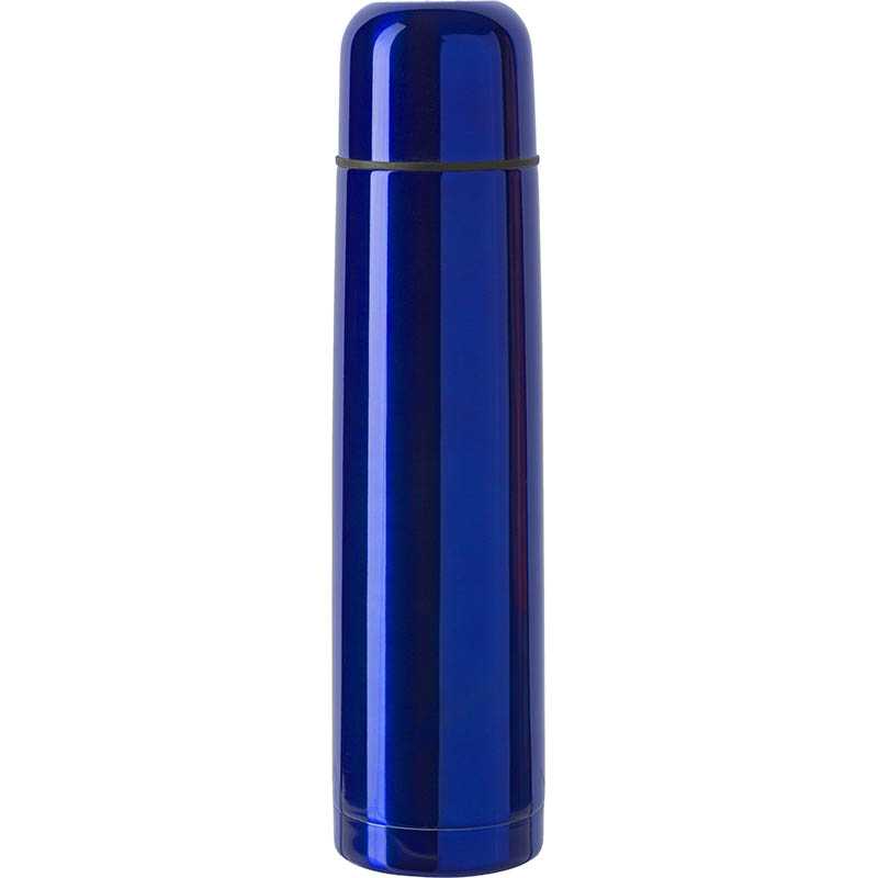 Stainless steel (s/s304) thermos flask (750 ml), double walled. Supplied in blue nylon (600D) case with a carry strap.