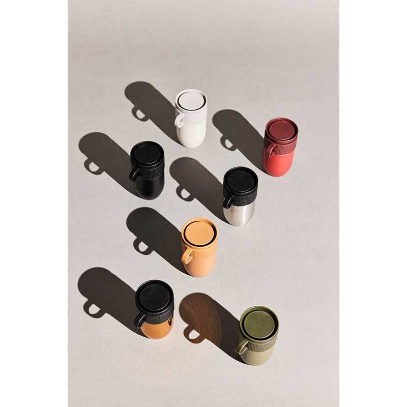 The Ted travel mug quickly becomes a favorite for those who enjoy always having a hot or cold drink on hand. Made from recycled stainless steel, the design is grip-friendly with a practical handle and a smart push function on the lid. Ted has a clean design and is patterned with the characteristic Saga spirit. The double-walled, vacuum-insulated design features a high-quality thin copper layer on the outside of the inner wall, providing better insulation to maintain the temperature. You can drink from the mug 360 degrees, as if there were no lid, giving the feeling of drinking from your favorite cup. Powder-coated. Dishwasher safe. Keeps warm for 4 hours and cold for 8 hours. Holds 28 cl. Design by Studio Sagaform. Delivered in a classic Sagaform box. Article number: 5018550 Material: Recycled steel / Recyclable plastic. Width: 7,5 cm; Height: 14 cm; 28 cl Color: Fudge (PANTONE 4261C)
