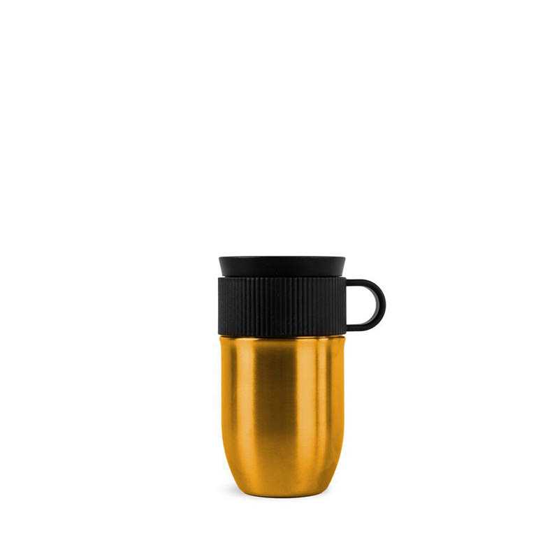 The Ted travel mug quickly becomes a favorite for those who enjoy always having a hot or cold drink on hand. Made from recycled stainless steel, the design is grip-friendly with a practical handle and a smart push function on the lid. Ted has a clean design and is patterned with the characteristic Saga spirit. The double-walled, vacuum-insulated design features a high-quality thin copper layer on the outside of the inner wall, providing better insulation to maintain the temperature. You can drink from the mug 360 degrees, as if there were no lid, giving the feeling of drinking from your favorite cup. Powder-coated. Dishwasher safe. Keeps warm for 4 hours and cold for 8 hours. Holds 28 cl. Design by Studio Sagaform. Delivered in a classic Sagaform box. Article number: 5018545 Material: Recycled steel / Recyclable plastic. Width: 7,5 cm; Height: 14 cm; 28 cl Color: Gold