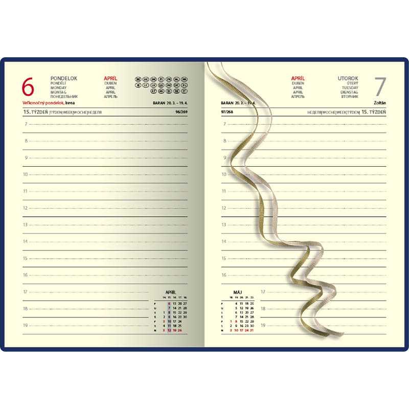 Denný diár s prehľadným kalendáriom na každý deň s pútkom a vloženým perom. Diár je v pevnej väzbe z pogumovaného poťahu s razbou roka. Obsahuje slovenské kalendárium.Kalendárium: SK/CZ-UK-DE-RU. Rozsah: 352 listov. Formát: 14,2 x 20,4 cm.
