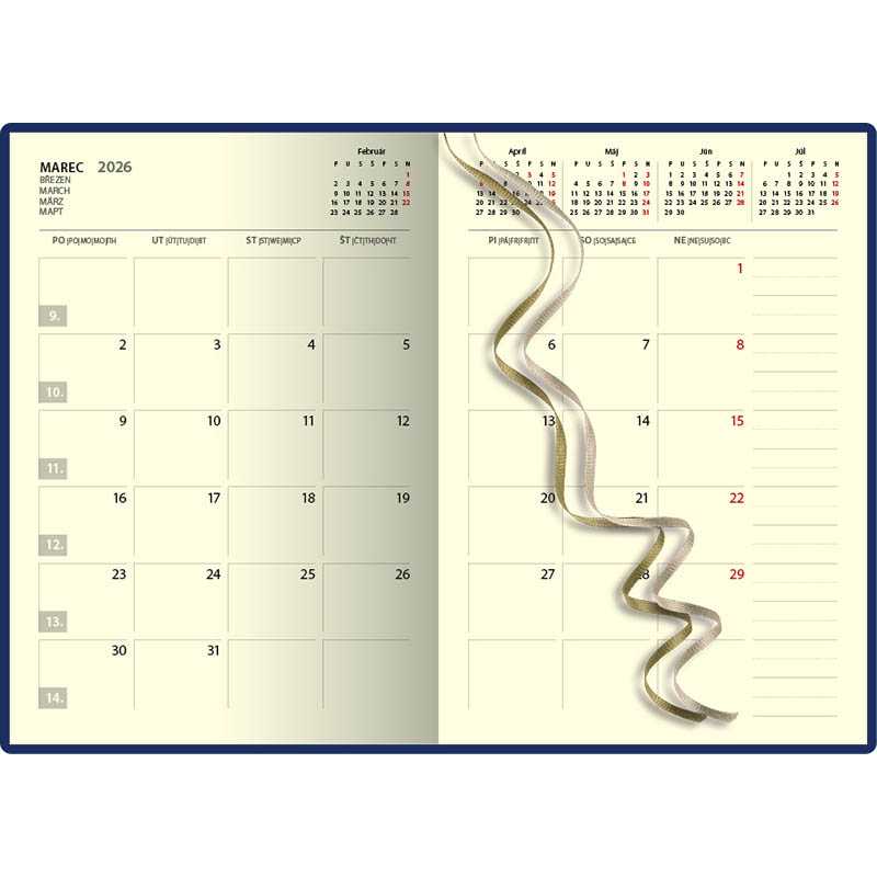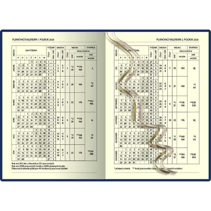 Nový rad diárov s výrazným letopočtom. Povrch má jemnú štruktúru a je vhodný pre všetky typy razieb. Denné rozloženie s česko-slovenským kalendáriom a doplnkovou angličtinou, nemčinou, maďarčinou a ruštinou.• kalendárium od decembra 2025• mesačný plánovací kalendár 2026 • mesačný plánovací kalendár 2027• ročný plánovací kalendár 2026–2027 • pracovný plánovací kalendár • sviatky Českej a Slovenskej republiky a a Slovenskej republiky • miesto pre osobné údaje • textilná záložka • perforované rožky • priestor na poznámky.Rozsah: 352 strán. Rozmer: 15 x 21 x 3 cm. Hmotnosť: 0,38. Papier: 70 g/m2 krémový papier. Väzba: tuhá knižná. Kalendárium: 6 jazyčné (CZ, SK, GB, DE, HU, RU) .