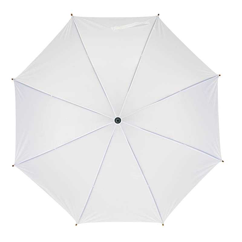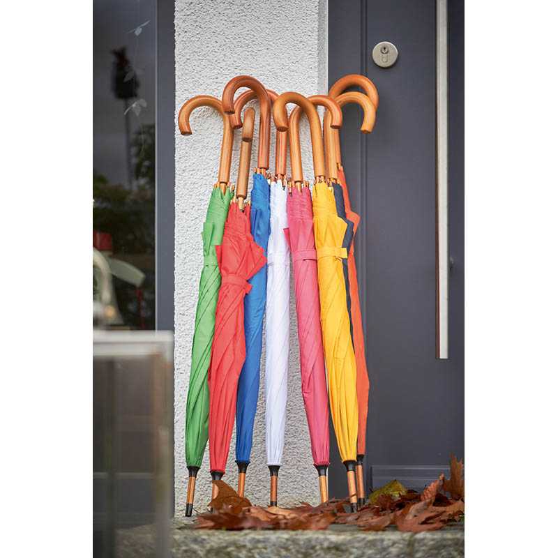 Automatický dáždnik vyrobený zo 190T polyesteru so zaoblenou drevenou rukoväťou a drevenými hrotmi.