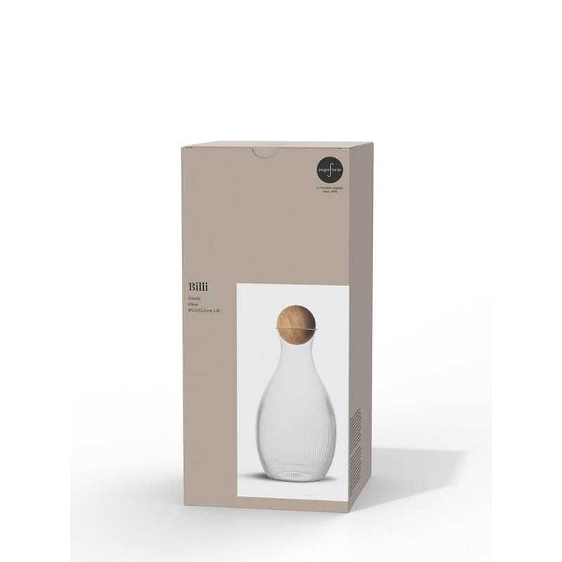 The Billi carafe features a unique design where the characteristic stripe signifies Sagaform. The shape of the Billi carafe is inspired by a Sagaform classic in the Nature series. The form is both functional and well-thought-out for versatile use. The carafe has a bamboo cork, which is also a typical Sagaform detail. Hand wash. Only for cold beverages. Size o12x22,5 cm 1,4 liter   Material:r PET Width:12 cm; Height: 22,5 cm Color: Clear