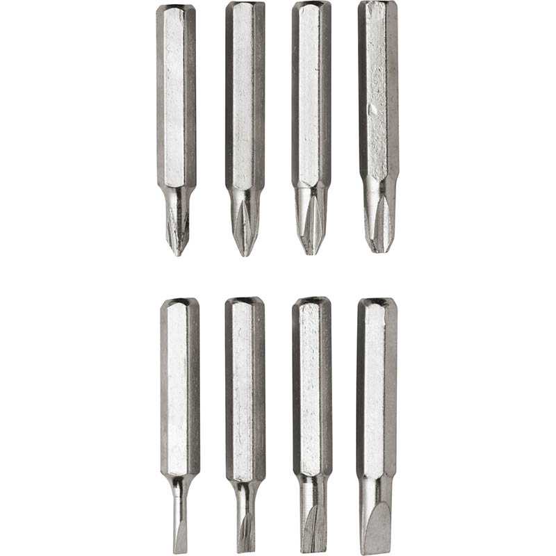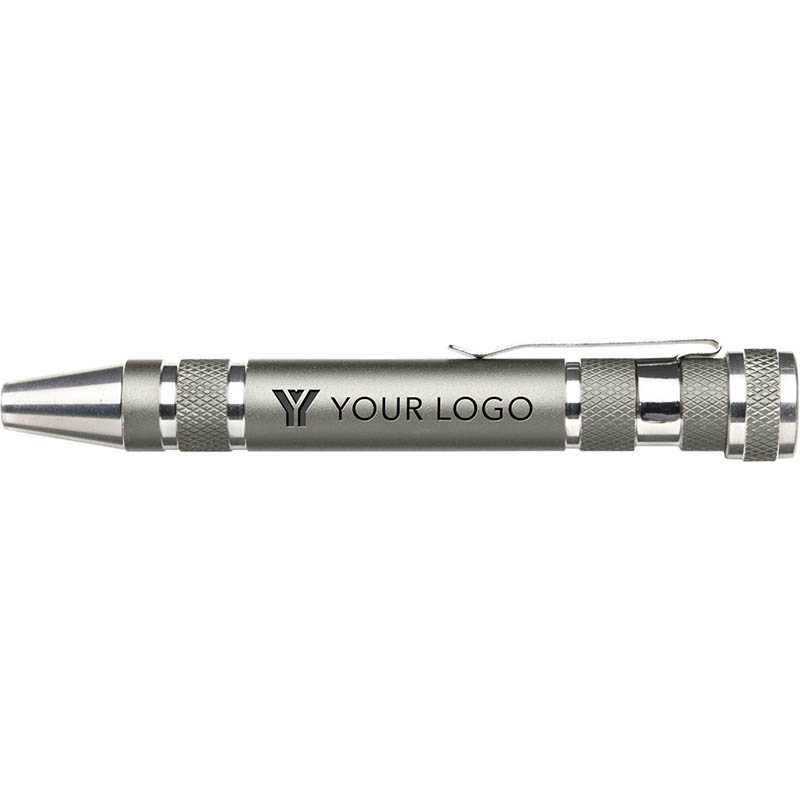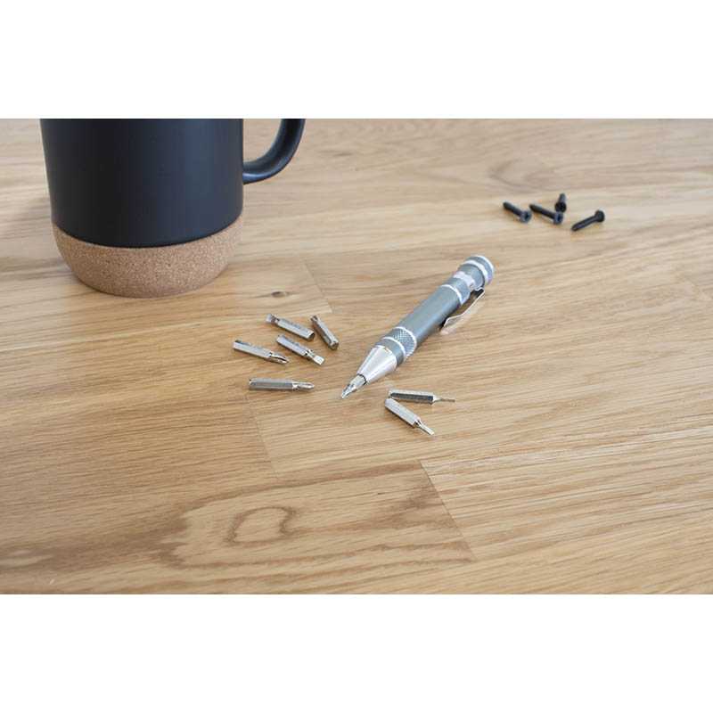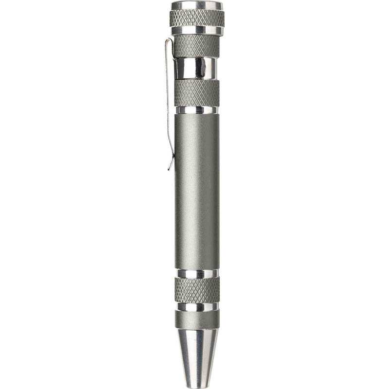 Steel pen-shaped pocket screwdriver. Including: four flat-head and four cross-head screwdriver bits.
