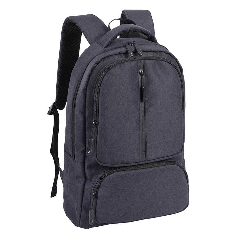 600D 2 barevný polyesterový batoh se zesílenými popruhy s jedním hlavním vnitřním oddílem. Obsahuje jednu vnitřní kapsu na 13'' laptop a USB nabíjecí kabel. Zipy k hlavnímu oddílu na zadní straně pro větší bezpečnost.
