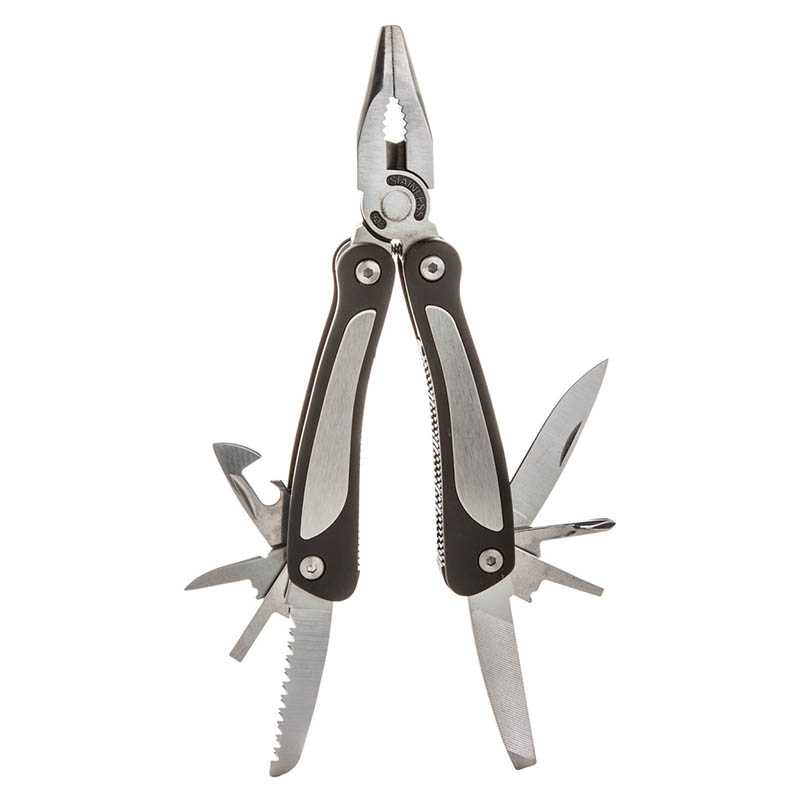 Stainless steel multi tool with soft feel handles and ten functions. Packaged in a nylon pouch with belt loop.