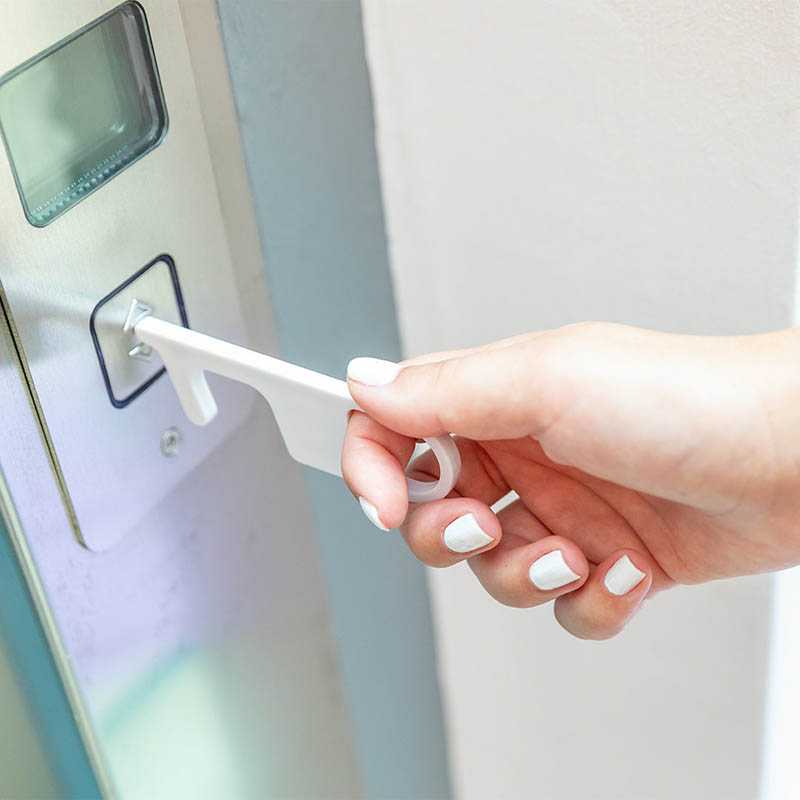 NOVINKA 2025. Hygienic, anti-contact safety key ring, made of resistant stainless steel. Specially designed to avoid touching public usage surfaces with your hands (door handles, switches, public use taps, ATMs…). With comfortable cut-out for the finger and presented in an individual bag. Recommended for laser printing.