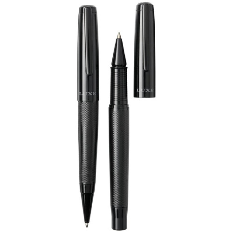 Dárková sada s kuličkovým perem a válečkovým perem v jednom s černou horní a spodní částí s lesklým povrchem dodávaná v dárkové krabičce Luxe. Kuličkové pero: 14 cm x 1,45 cm, hmotnost: 40 g, délka zápisu: 800 m. Válečkové pero: 13,8 cm x 1,45 cm, hmotnost: 54 g, délka zápisu: 400 m.