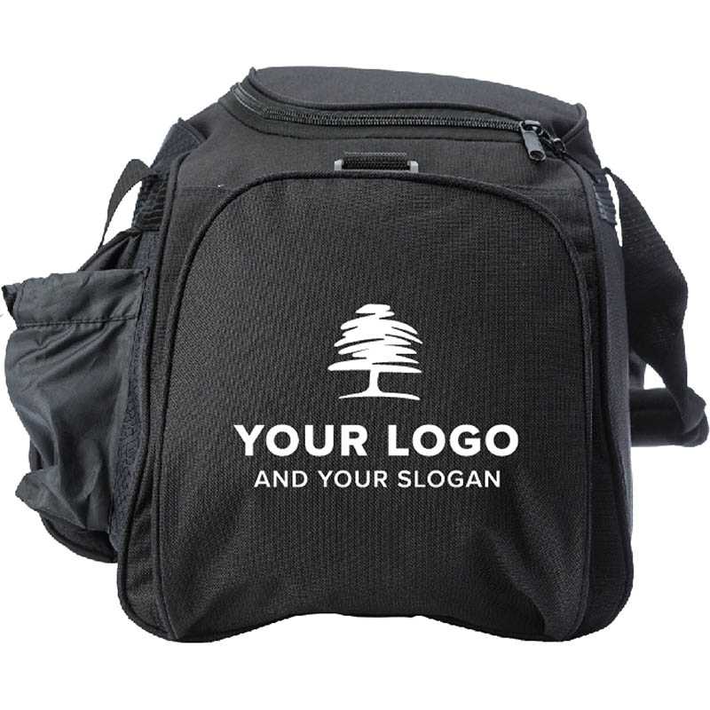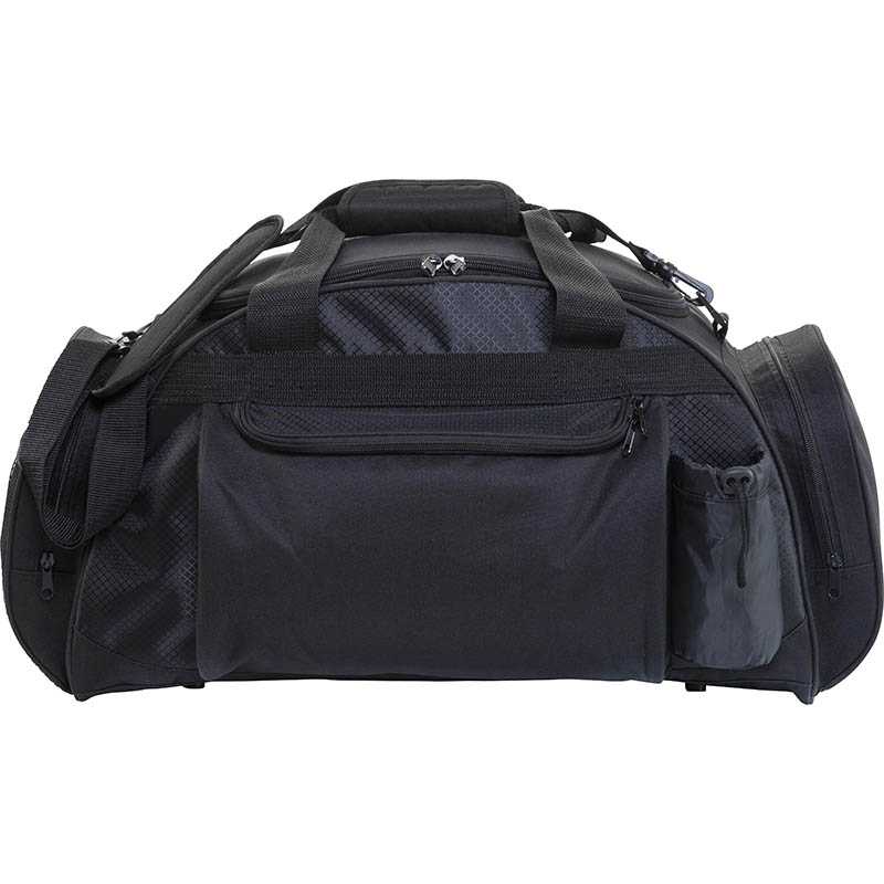 Polyester (600D) sports bag with a front zippered pocket, a side pocket for a bottle, a side pocket for a headset, and one large zipped compartment (bottle not included).