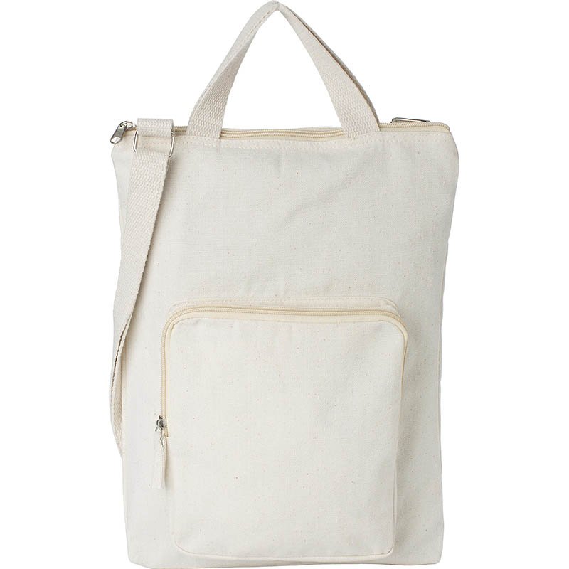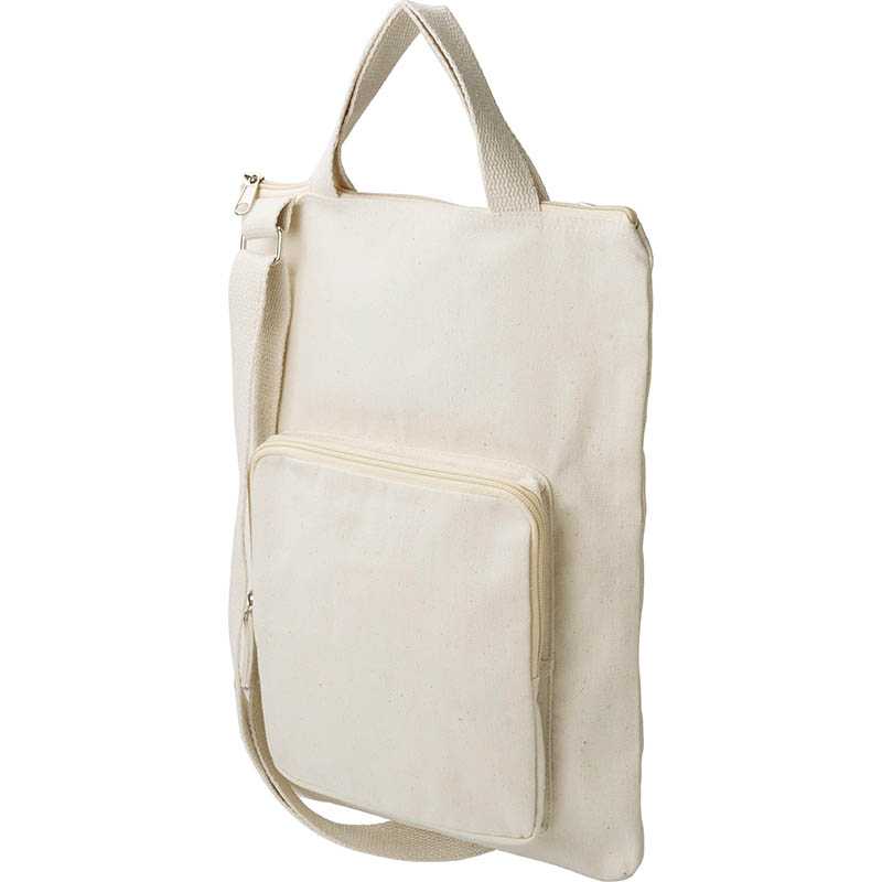 Cotton (340 g/m2) laptop bag (15 inch). One large zippered compartment, small front pocket with zipper. Two short handles and one adjustable shoulder strap.