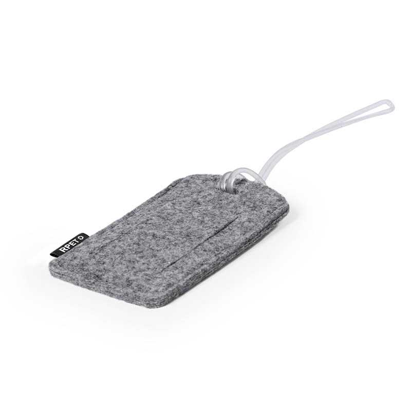 NOVINKA 2025. Luggage identifier made of RPET felt. Designed to be attached to any suitcase using its flexible strap and with a card for basic information. Made in RPET felt, with window and an RPET label.RPET felt is the result of the combination of the recycling processes of plastic materials along with the millenary technique of felt manufacturing, resulting in an eco-trend material that, in addition to being of recycled origin, also becomes recyclable.