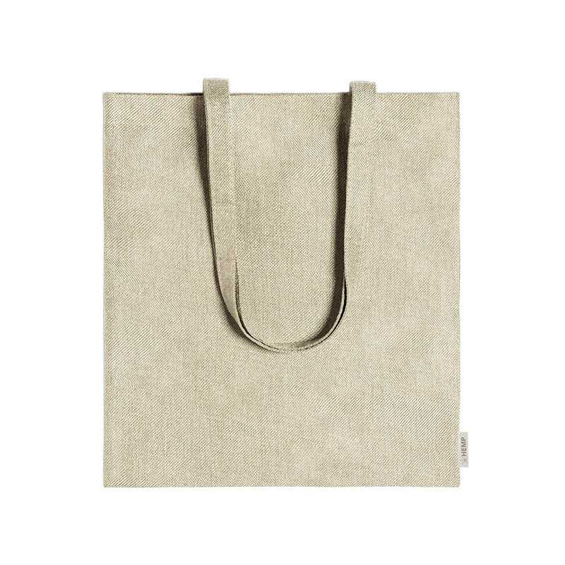 NOVINKA 2025. Nature line bag, made of 100% hemp fabric of 200g/m2 and obtained from the Cannabis plant. These cultivation and fibre production processes are environmentally friendly, resulting in a highly resistant fabric, of natural and sustainable origin. Sewn finish, with long handles of 70cm and resistance up to 7kg in weight. HEMP emblem on the label.