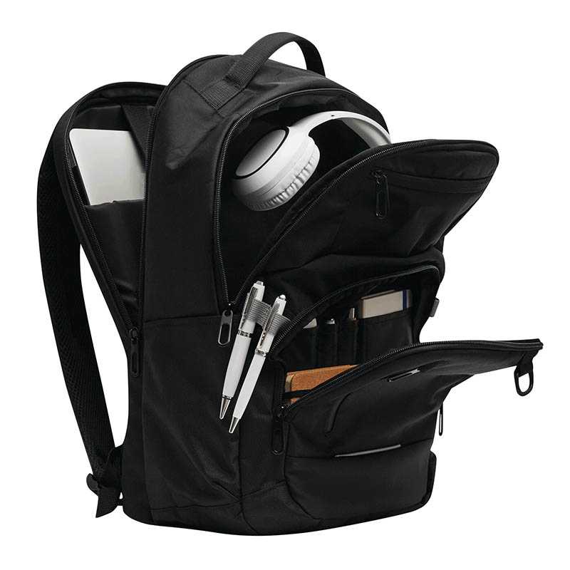NOVINKA 2025. Backpack AARHUS: 1 zipped front compartment with organiser, 1 front pocket with vertical zip, 1 front pocket with horizontal zip and velvet lining (ideal for a smartphone etc.), reflective strip, 2 slip-in pockets at the sides, 2 zipped main