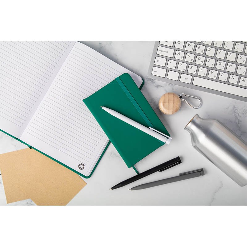Blok potiahnutý recyklovanou PU kožou so 100 linkovanými listami z recyklovaného papiera. So záložkou v zodpovedajúcej farbe a gumičkou. Veľkosť A6.