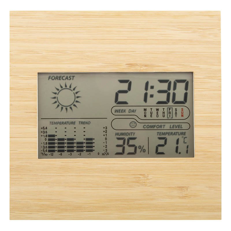 Meteorologická stanica a digitálne hodiny s bambusovým predným panelom. Funkcie: budík, kalendár, teplomer, zobrazenie vlhkosti a pamäť teploty. Pracuje s 2 AA batériami, ktoré nie sú súčasťou balenia.