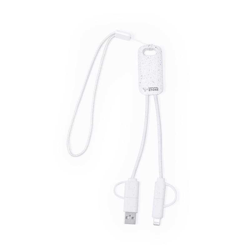 NOVINKA 2025. Charging cable made from natural stone extracts in combination with resistant ABS. With Type C/USB input connections and Type C, Lightning and Micro USB outputs. 5V DC 2.4A. Presented in an individual kraft design box.Made from natural stone extracts, helping to reduce the use of plastics, as well as providing a smooth and resistant finish.