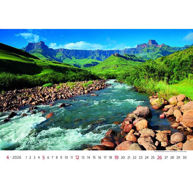 Fotografie dvanásť pestrofarebných prírodných výjavov z celého sveta. Romantické zábery horských údolí i nížin, vodstiev i púští. Kalendárium na čiernom pozadí.Priestor na potlač: 48 x 6 cm. Rozsah: 14 listov. Rozmer: 48 x 33 x 1 cm. Hmotnosť: 0,6. Papier: 150 g/m2. Väzba: dvojitá špirála. Kalendárium: neutrálne.