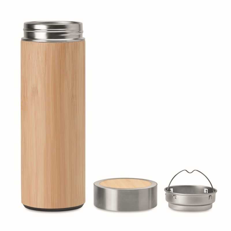 Dvoustěnná nerezová láhev s bambusovým povrchem a izolačním vakuem. 400 ml, přídavný čajový infuzer. Bambus je přírodní materiál, může dojít k mírným změnám barvy, dekorace a velikosti. Bambus je přírodní materiál, může dojít k mírným změnám barvy, dekora