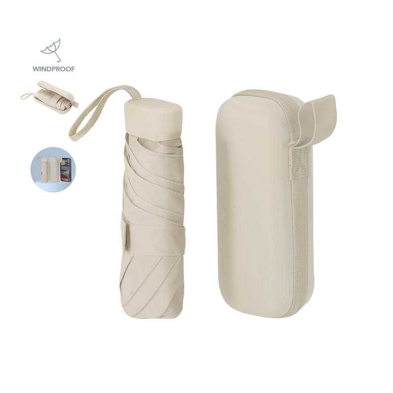 NOVINKA 2025. Foldable umbrella with a diameter of 90 cm made from 190T polyester with 6 panels. With manual opening, windproof system, and fiberglass ribs. Compact handle and matching strap. Presented in a rigid transport case made from PU with zipper closure and matching strap.