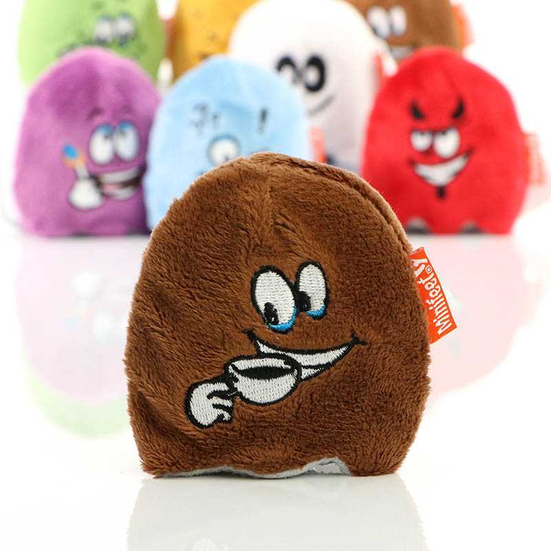 Anti-stress cuddly toys with microfibre underside for cleaning smooth surfaces.