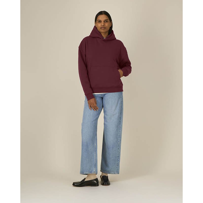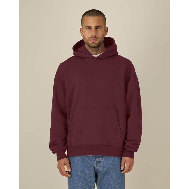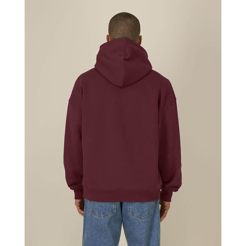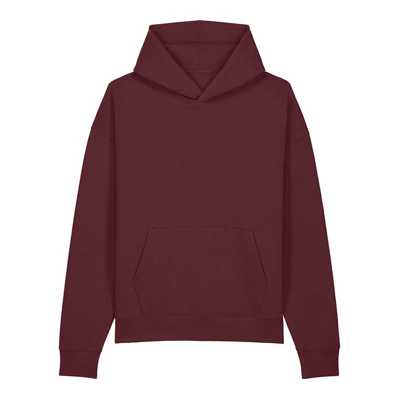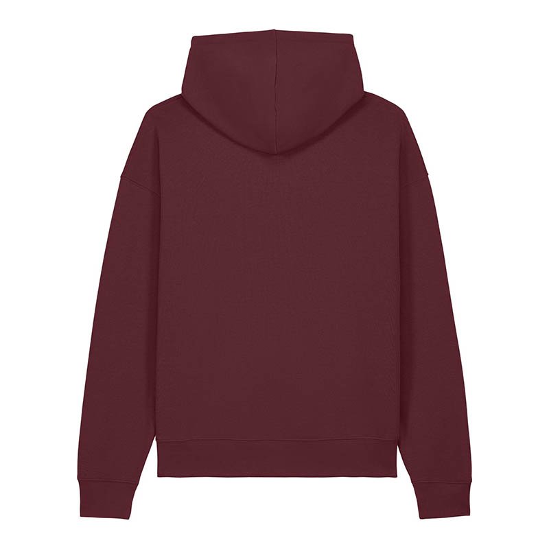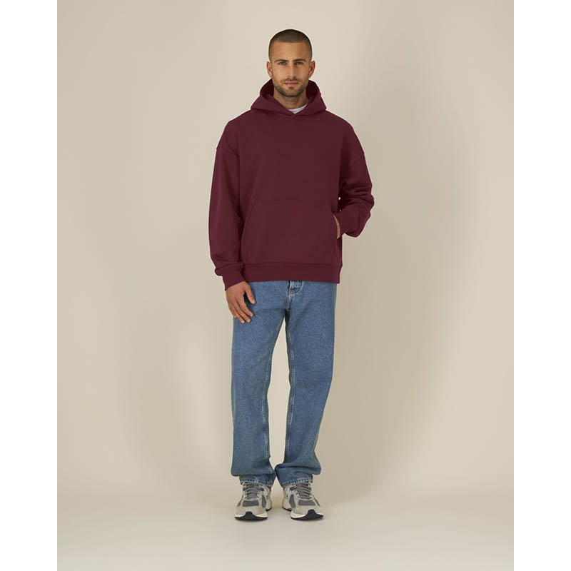 85 % organická bavlna/15 % recyklovaný polyester.Prstencovo spriadaná česaná bavlna.Rovný strih.3-vrstvový kartáčovaný flís, LSF (Low Shrinkage Fleece: predzrazený flís).1/2 kruhu vzadu.Klokanie vrecko.1 x 1 rebrovaný spodný okraj a manžety.Dvojité prešívanie na manžetách, prieramkoch, spodnom okraji a 1/2 kruhu.Podlepený výstrih vnútri na zadnej strane.Podšitá kapucňa z hlavného materiálu so zaväzovaním na šnúrku.Okrúhla šnúrka s recyklovanými kovovými koncovkami a očkami.