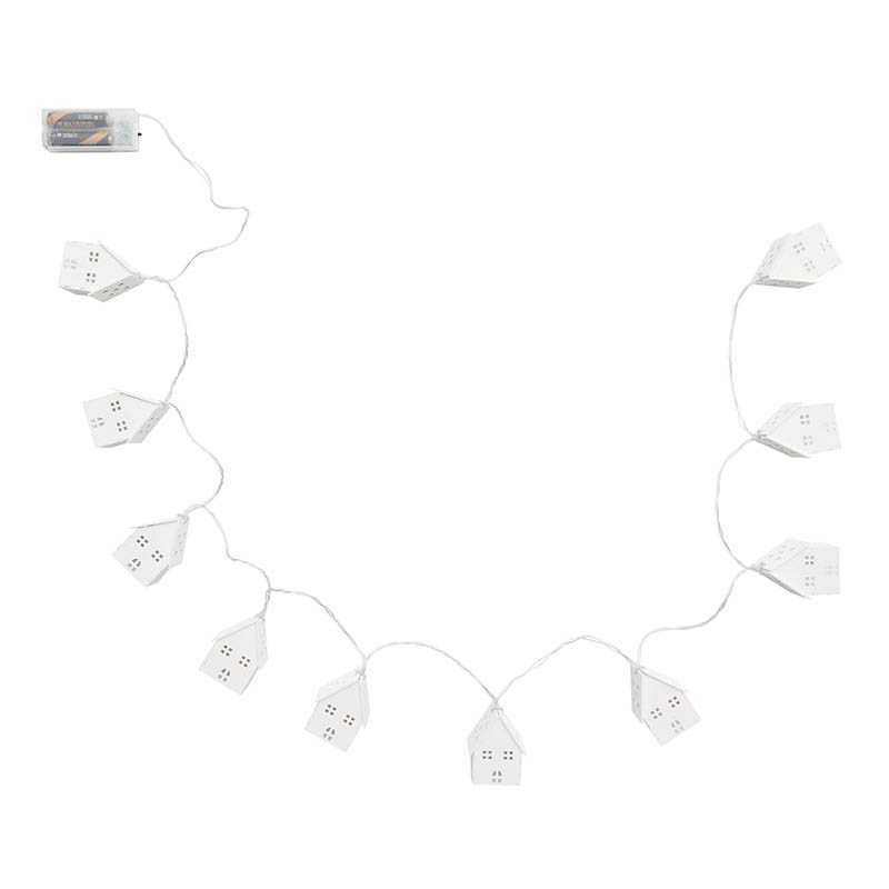 Light chain COSY LIGHTS: approx. 168 cm long, each of the 10 wooden houses is illuminated with a warm white LED, timer function (6 hours on, 18 hours off), battery-operated (2x AA batteries not included)