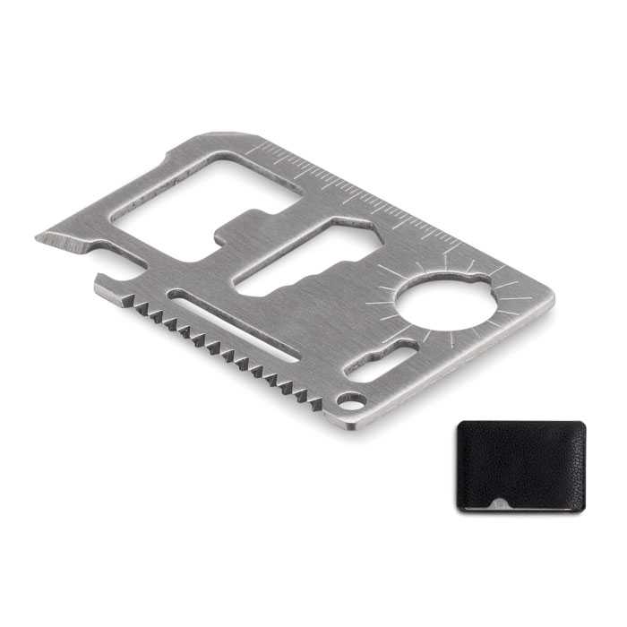 Multifunkční nářadí z nerezové oceli ve tvaru kreditní karty se 20 funkcemi, v pouzdře z PU kůže.