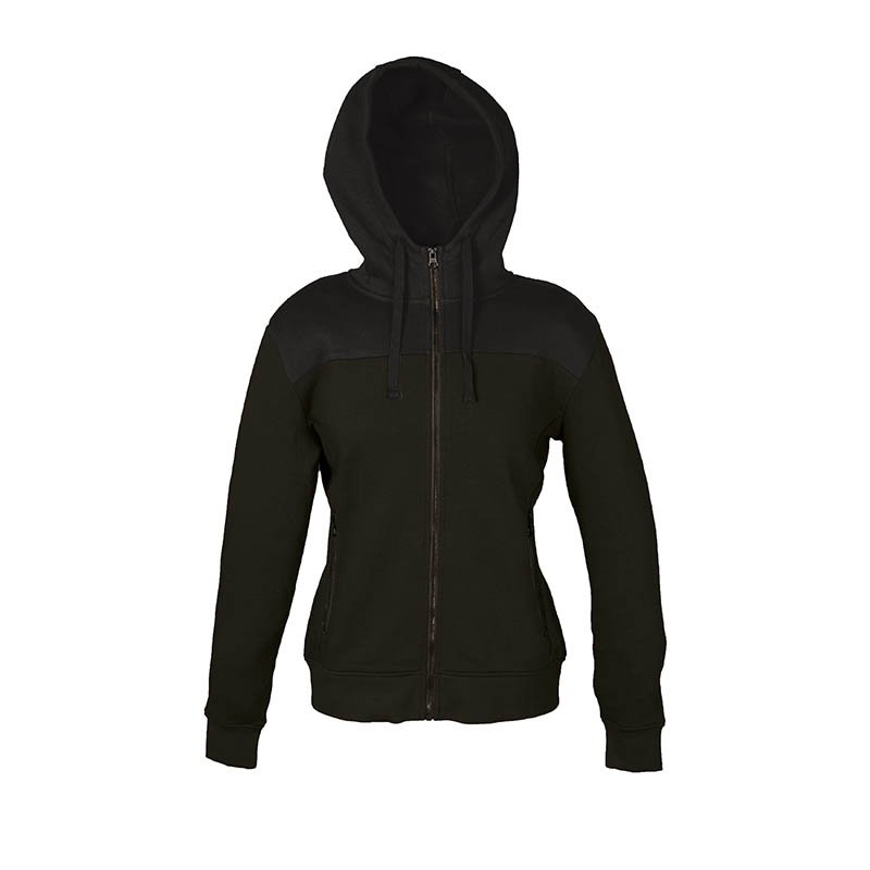 Kvalita.50 % prstencovo spriadaná bavlna – 50 % polyester.Štýl.Elastanový rebrovaný spodný okraj a manžety.Vsadené rukávy.2 klokanie vrecká.Podšitá kapucňa so sťahovacou šnúrkou tón v tóne.Skrytý zips.Priliehavý strih.Strihané a šité.