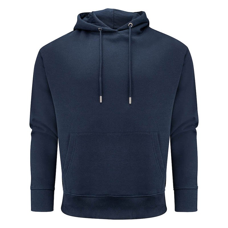 NOVINKA 2024. Relaxed hoodie with dropped shoulders and kangaroo pocket on the front. Wide rib endings at sleeve and bottom hem. Tone on tone drawstring with metal bulletpoints. Colors: 120 grey melange, 484 dusty red, 514 summer blue, 600 navy, 784 aloe green, 900 black 85% Organic Cotton, 15%, Recycled Polyester 350 g/m2, szczotkowana wewnętrznie Oeko-Tex, OCS, GRS certified