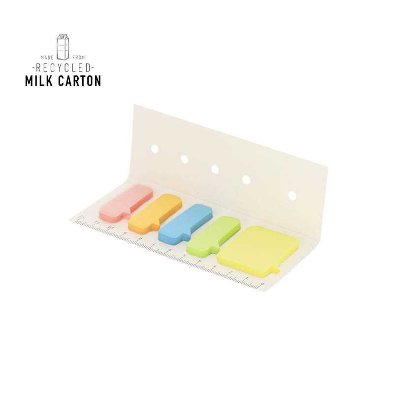 NOVINKA 2025. Sticky note pad made of recycled milk carton. Includes: 50 medium sticky notes and 200 mini sticky notes with design. Incorporates a practical 12 cm integrated ruler. With Recycled Milk Carton designation.Milk cartons are mostly made of cardboard and aluminum. During their recycling process, different materials from the container are separated for reuse and new use, thus contributing to the infinite journey of the circular economy. This material is characterized by its high recyclability, as well as its lightness and strength.