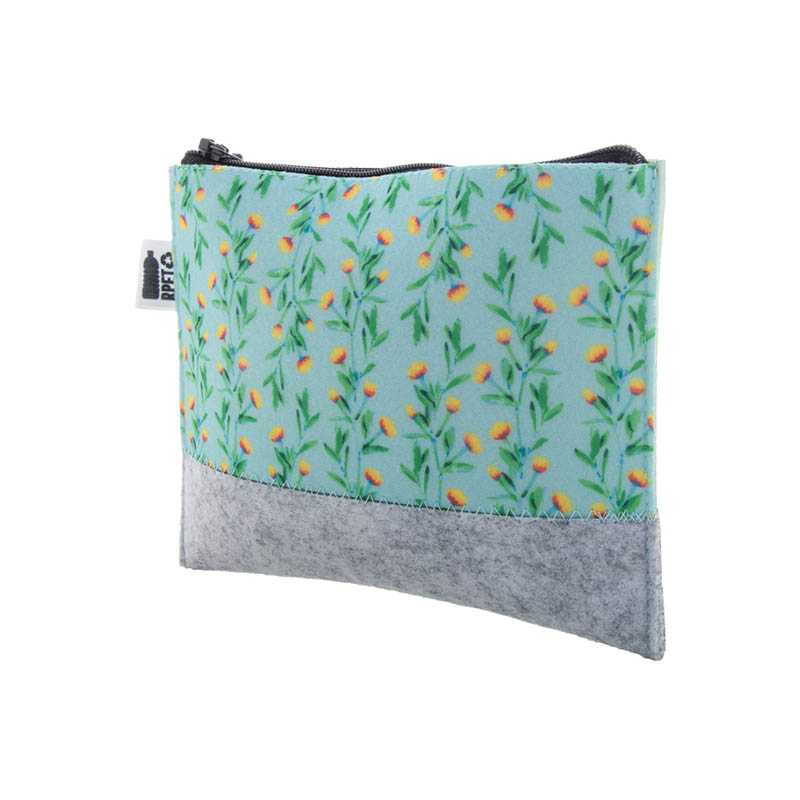 Na zákazku vyrobená kozmetická taštička na zips z RPET plsti s celoplošne potlačenou sublimačnou grafikou. Cena zahŕňa sublimačnú tlač, nezahŕňa tlačovú prípravu. S výrazným štítkom RPET. Min. mn.: 50 ks.