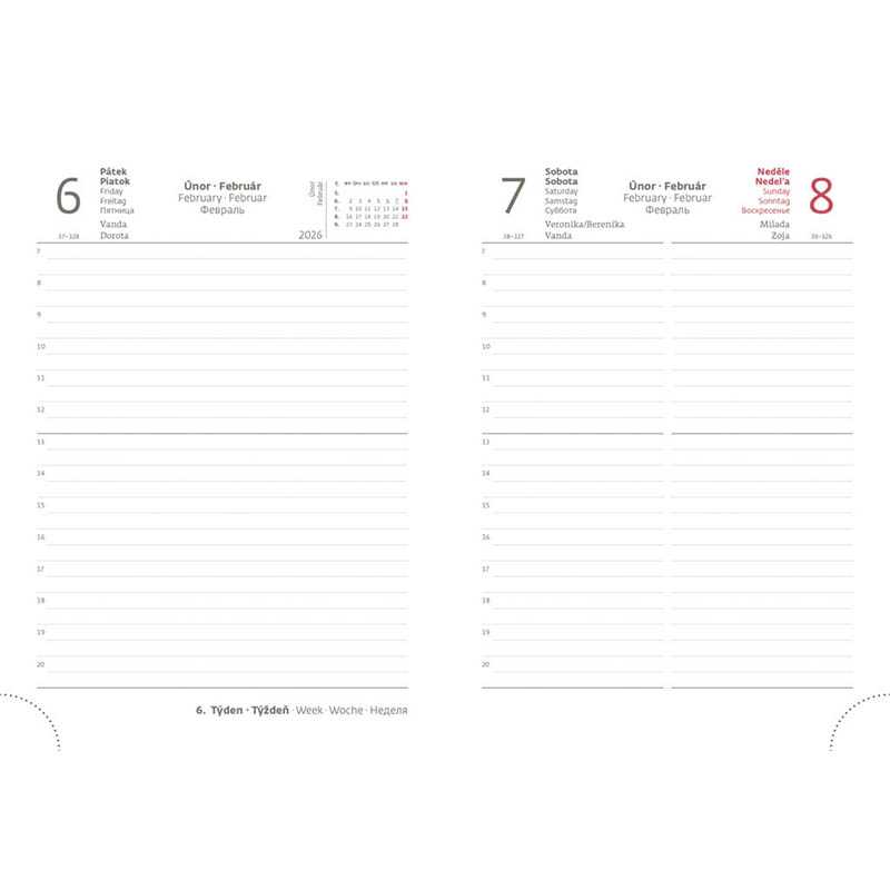 Nový, cenovo dostupný rad diárov s obálkou z ekologického papiera spája štýl a udržateľnosť. Denné rozloženie s česko-slovenským kalendáriom a doplnkovou angličtinou, nemčinou, maďarčinou a ruštinou.• kalendárium od decembra 2025• mesačný plánovací kalendár 2026 • mesačný plánovací kalendár 2027• ročný plánovací kalendár 2026–2027 • pracovný plánovací kalendár • sviatky Českej a Slovenskej republiky a medzinárodné sviatky • rozšírený zoznam českých mien • mapa Českej a Slovenskej republiky