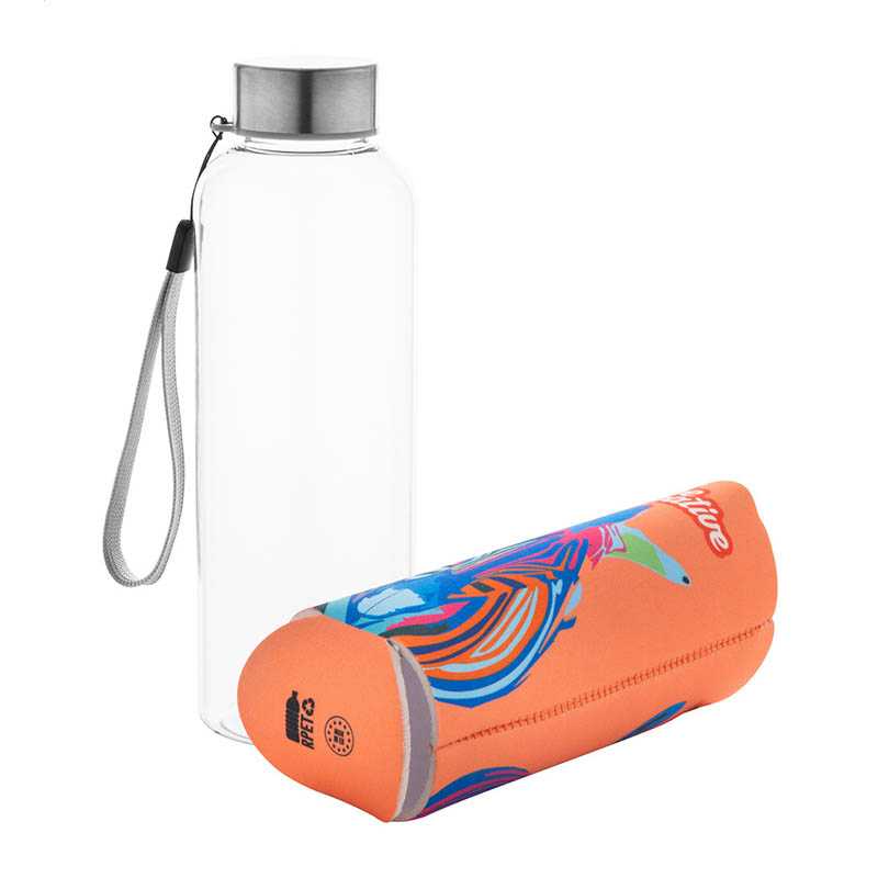 NOVINKA 2025. Fľaša RPET s nerezovým uzáverom v zákazkovom, RPET neoprenovom obale s plnofarebnou potlačou, nazahrnuje tlačovú prípravu 500 ml.