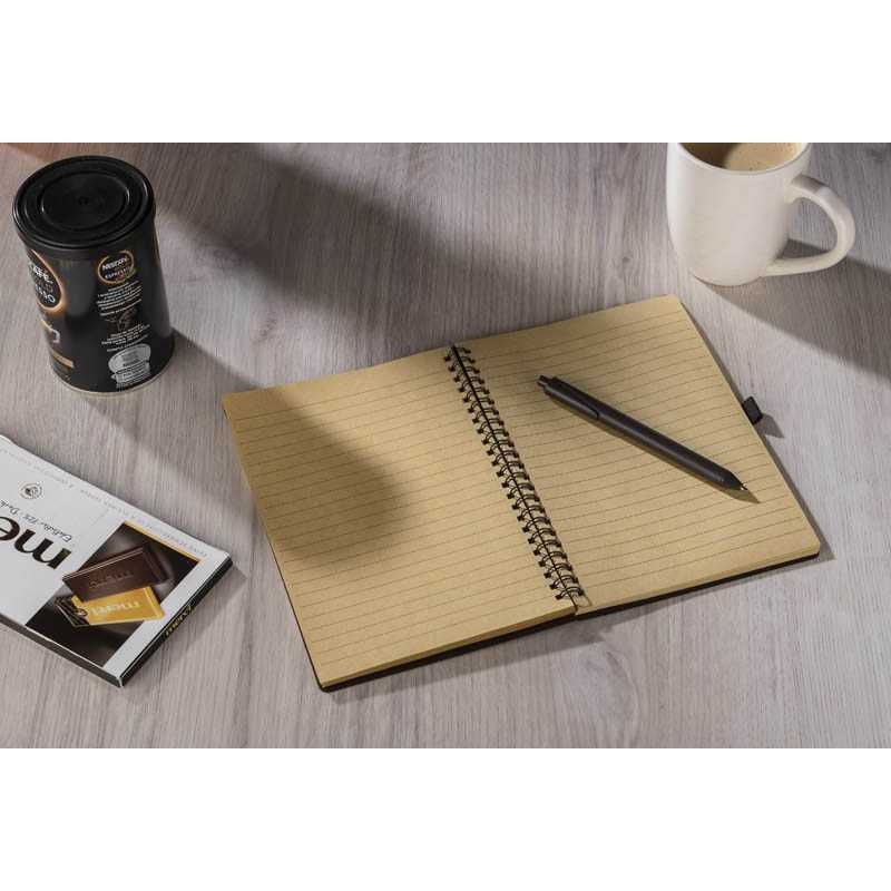 Notebook KOPI je dokonalým nápadem na ekologický dárek. Obal bloku a pero jsou vyrobené z plastu smíchaného ve 40% s kávovými zrny, což umožňuje použití mnohem menšího množství plastu. Má 70 řádkových listů z hnědého recyklovaného papíru. Sada obsahuje kuličkové pero s modrou náplní. Celé je to zabaleno v pěkné hnědé kartonové krabici, která dokonale odpovídá ekologickému trendu.