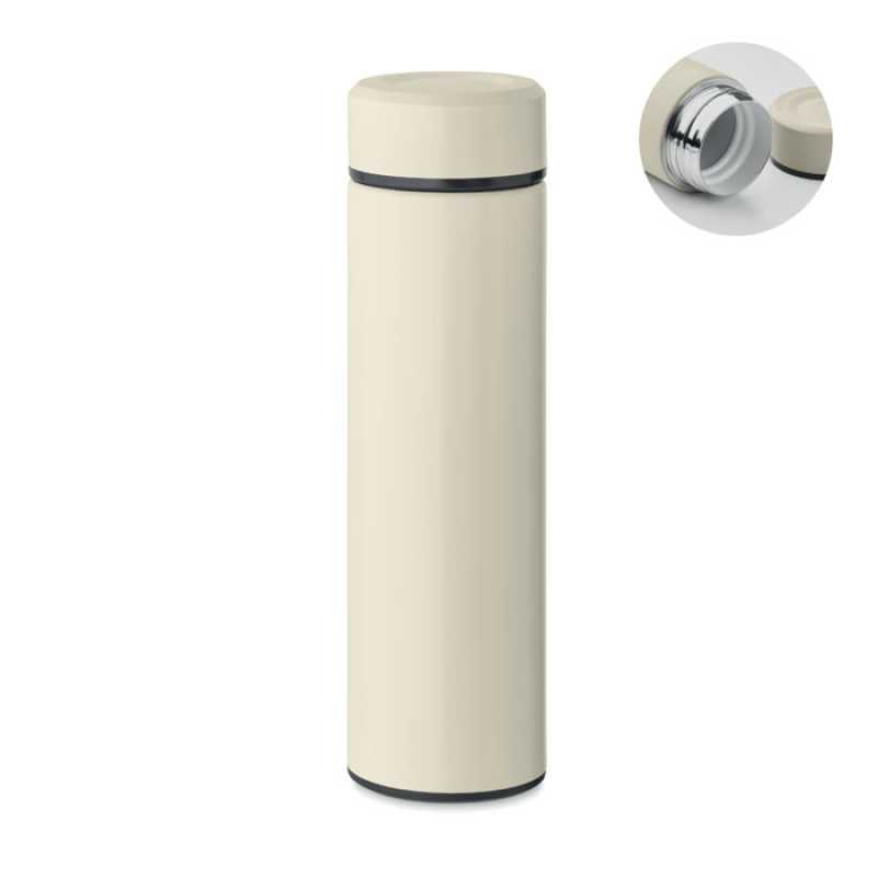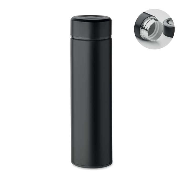 NOVINKA 2025. Stainless steel, double wall, thermal bottle, with touch-sensitive temperature gauge integrated in the lid. 500ml capacity and matt finish. With BPA free safety lid and presented in an attractive design box. Battery powered (button cell included) and instruction manual available in English and Spanish.