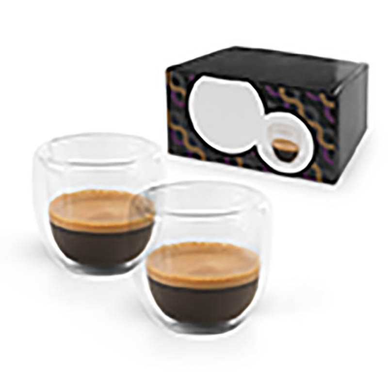 Izotermická sklenená kávová súprava s 2 vzduchom izolovanými šálkami s dvojitým telom a objemom až 75 ml. Dodávané v prispôsobiteľnej darčekovej krabičke. Krabička: 133 x 65 x 65 mm