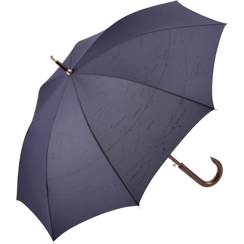 Convenient automatic function for quick opening, wind resistant properties for higher frame flexibility and stability in windy conditions, flexible fibreglass ribs, inside cover with allover constellation design, shaft and shapely crook handle made of genuine wood