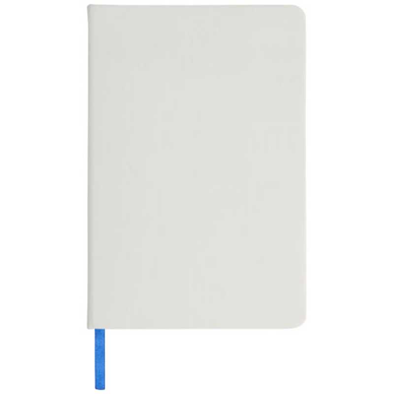 Bílý zápisník A5 s barevným elastickým zavíráním a stužkou. Obsahuje 80 listů linkovaného papíru (60g/m2). Digitální tisk lze provést na přebal.