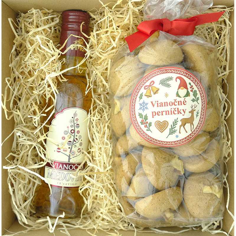 Darčeková krabica > prírodná / prírodná > 21x21x10 cm, Vianočná medovina 0,18 l, Vianočné perníky 250g